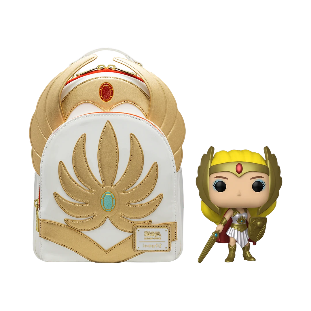 Help She-Ra defend Etheria with this exclusive She-Ra Pop! and Mini Backpack set. Pop! She-Ra has her magical sword drawn, ready to fight against the evil Horde. She makes a powerful addition to your Retro Toys collection. With the She-Ra Mini Backpack, you can power through your day in style. The front of the backpack displays Adora’s dazzling crown, the golden metallic wings arcing above. On the back, the message “Defender of Etheria,” evokes She-Ra’s mission. Backpack features include adjustable straps, side pockets, shiny gold metal hardware, enamel zipper charm, vegan leather (polyurethane), and metallic, iridescent, raised glitter gem, applique, and printed details. Backpack dimensions: W 22.8 cm x H 26.7 cm x D 11.4 cm (Please note: width is measured across the bottom of the backpack.) Vinyl figure is approximately 10 cm tall.