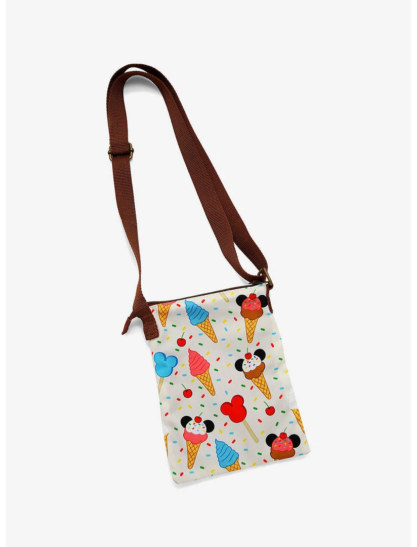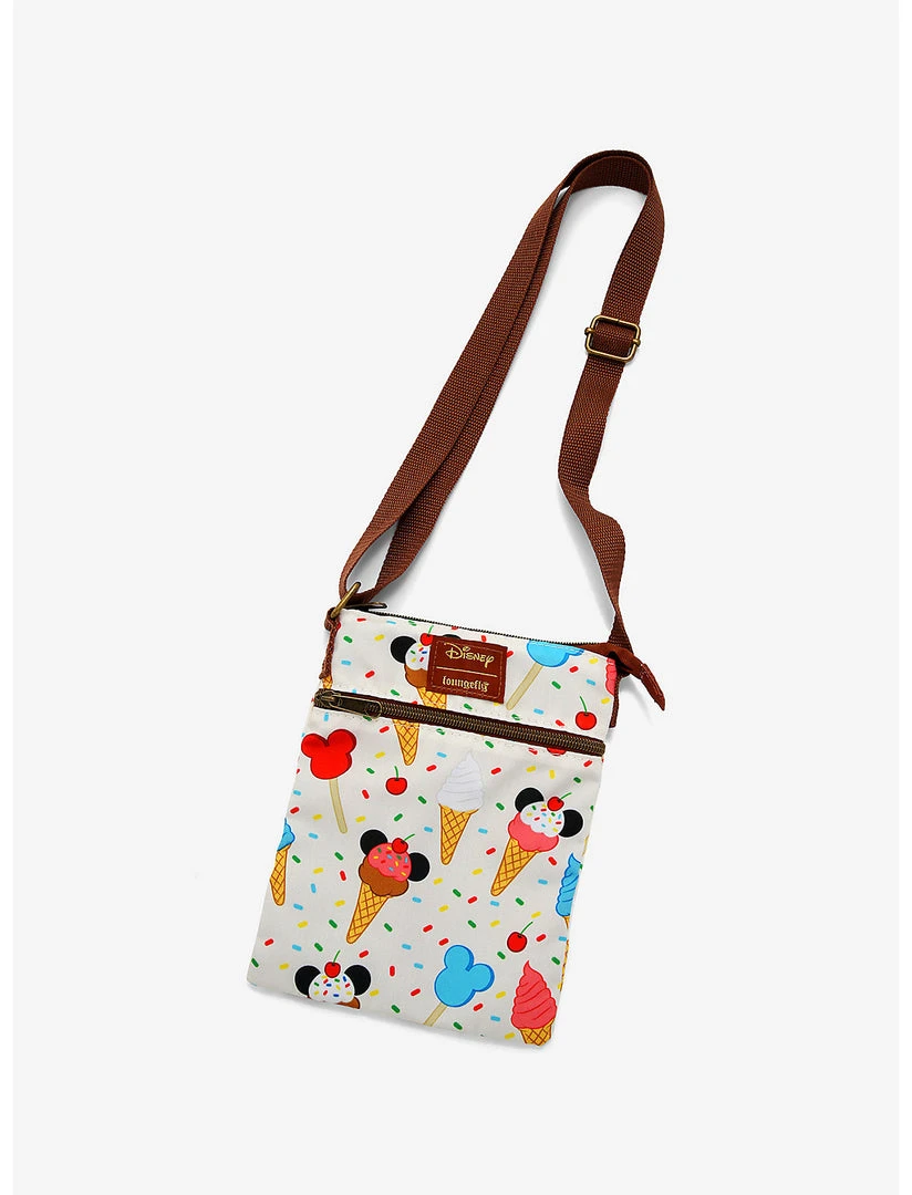 Mickey Mouse keeps it sweet. This passport crossbody bag features Mickey Mouse ice cream cones and bars. It has an adjustable crossbody strap, top zipper closure and front zipper pocket.