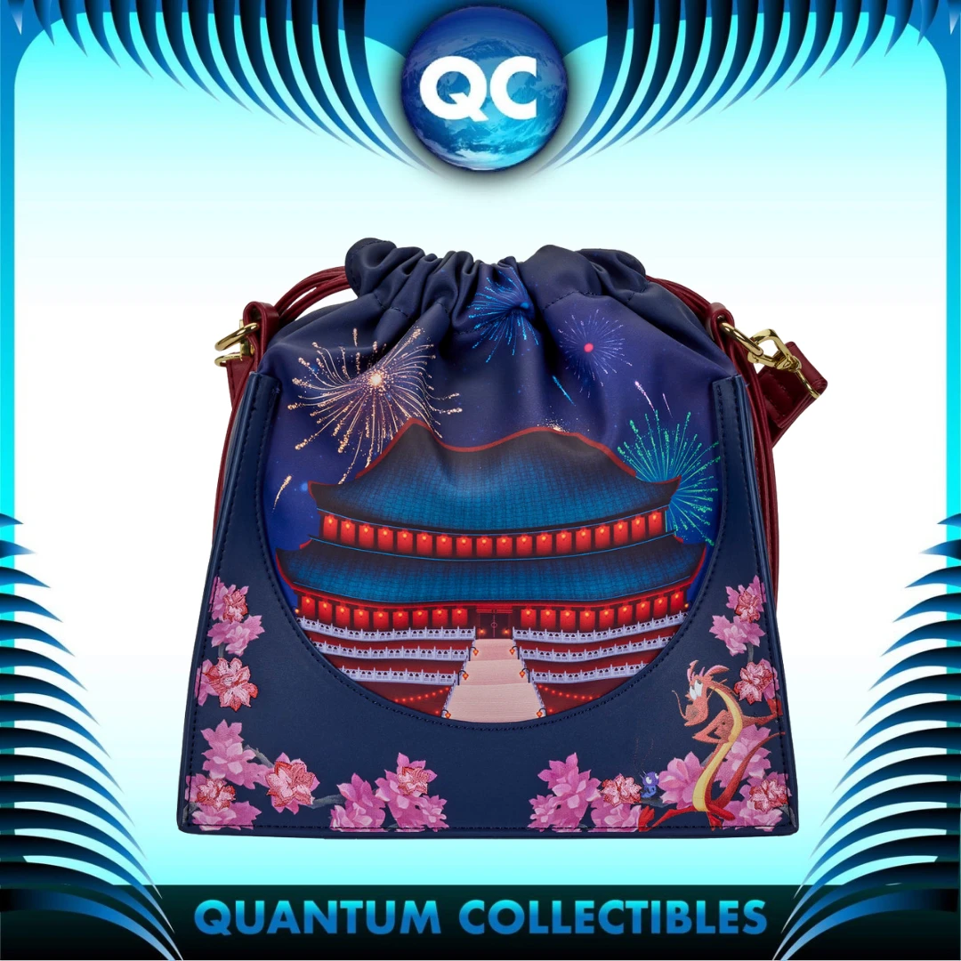 Fireworks erupt over the palace to mark Mulanβs victory over Shan Yu. Celebrate this moment and carry it with you on this Mulan Castle Crossbody Bag. On the front, this drawstring bucket crossbody bag shows the palace, lit up by fireworks and framed by embroidered pink blossoms. Even Mushu makes an appearance. On the back, Mulan and Li Shang gaze at each other, surrounded by pink flowers. This accessory is the perfect complement to any Disney outfit.
