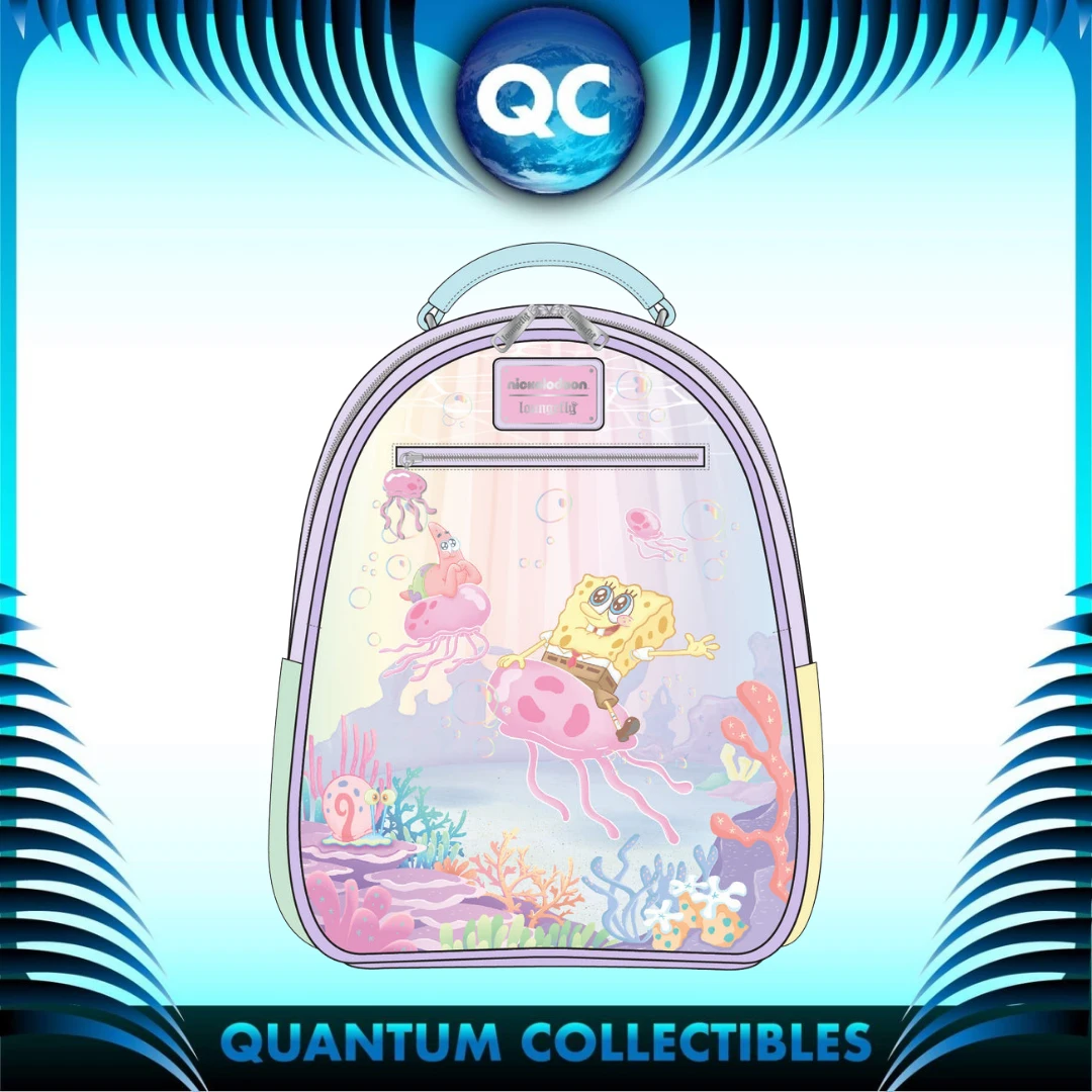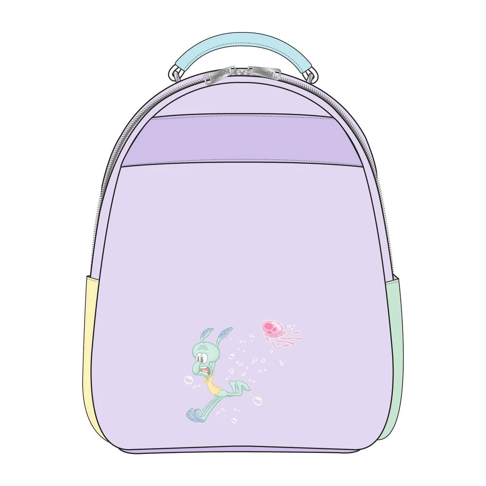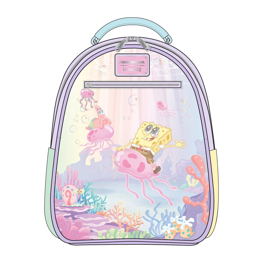 With a la-la-la-la-la, follow SpongeBob to Jellyfish Fields, where jellyfish buzz about, making their jellyfish jelly. Make room for the day’s catch in this SpongeBob SquarePants Jelly Fishing Mini Backpack. On the front, SpongeBob is riding a graceful jellyfish, accompanied by Patrick Star and Gary, in a pastel wonder of coral and iridescent printed bubbles. SpongeBob’s eyes are wide with happiness, as he is in his element. An enamel zipper charm of a jellyfish completes the look. On the back, Squidward runs from a jellyfish that’s about to sting him. Note the coordinating inside lining.