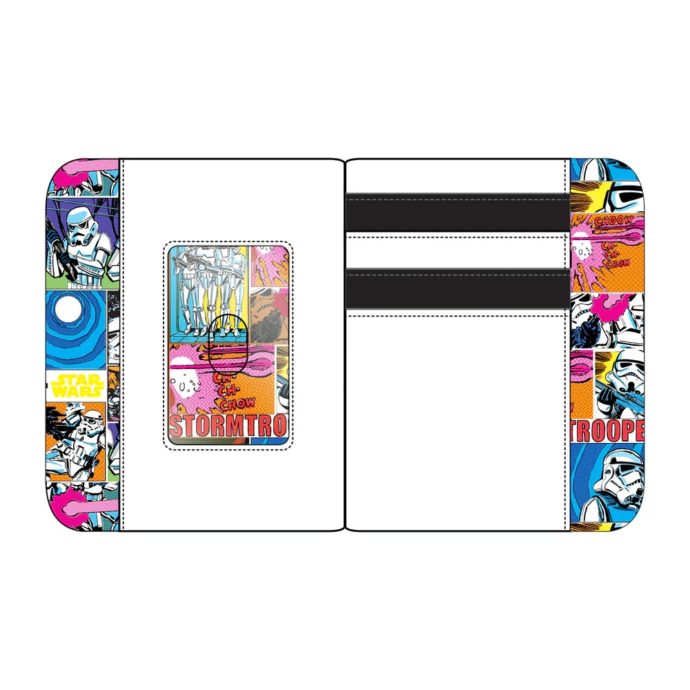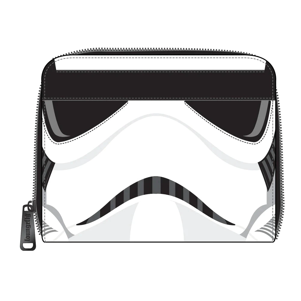 Blast through your day with the help of a Star Wars Stormtrooper and this Stormtrooper Lenticular Cosplay Zip Around Wallet. The unmistakable Stormtrooper’s white helmet appears on the front of the wallet. A lenticular screen, placed in the eyewear of the Stormtrooper, reveals an alternate view of Hans Solo, Chewbacca, and Princess Leia. An embroidered Stormtrooper symbol appears on the back.