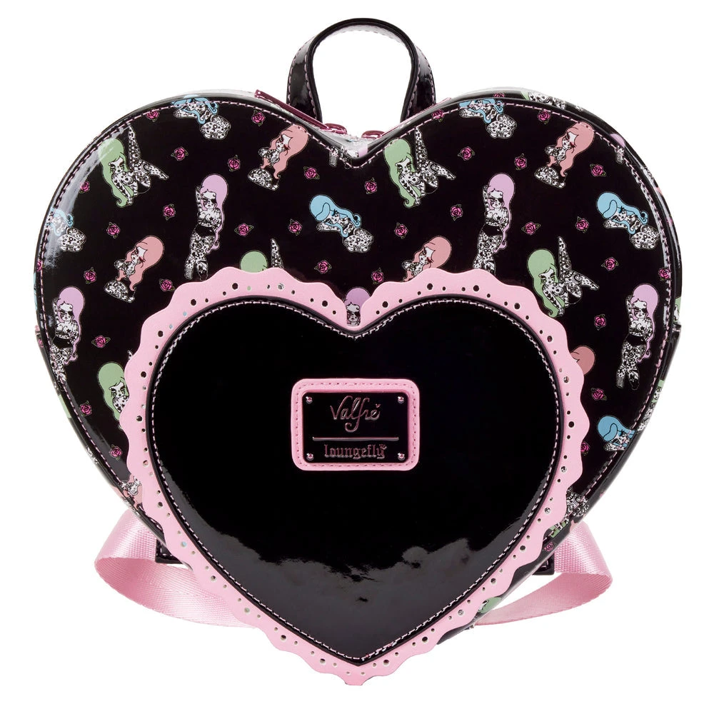 Discover a new dimension and keep it close to your heart with this Valfré Lucy Tattoo Heart Mini Backpack. The entire backpack is shaped like a black heart with pink trim accents, and the smaller, front zipped compartment is another heart. A debossed and printed motif of neon pink, blue, and purple silhouettes of vivacious, confident, tattooed women float among roses, which adds a whimsical and feminine touch.